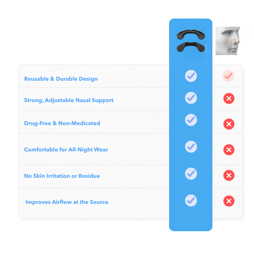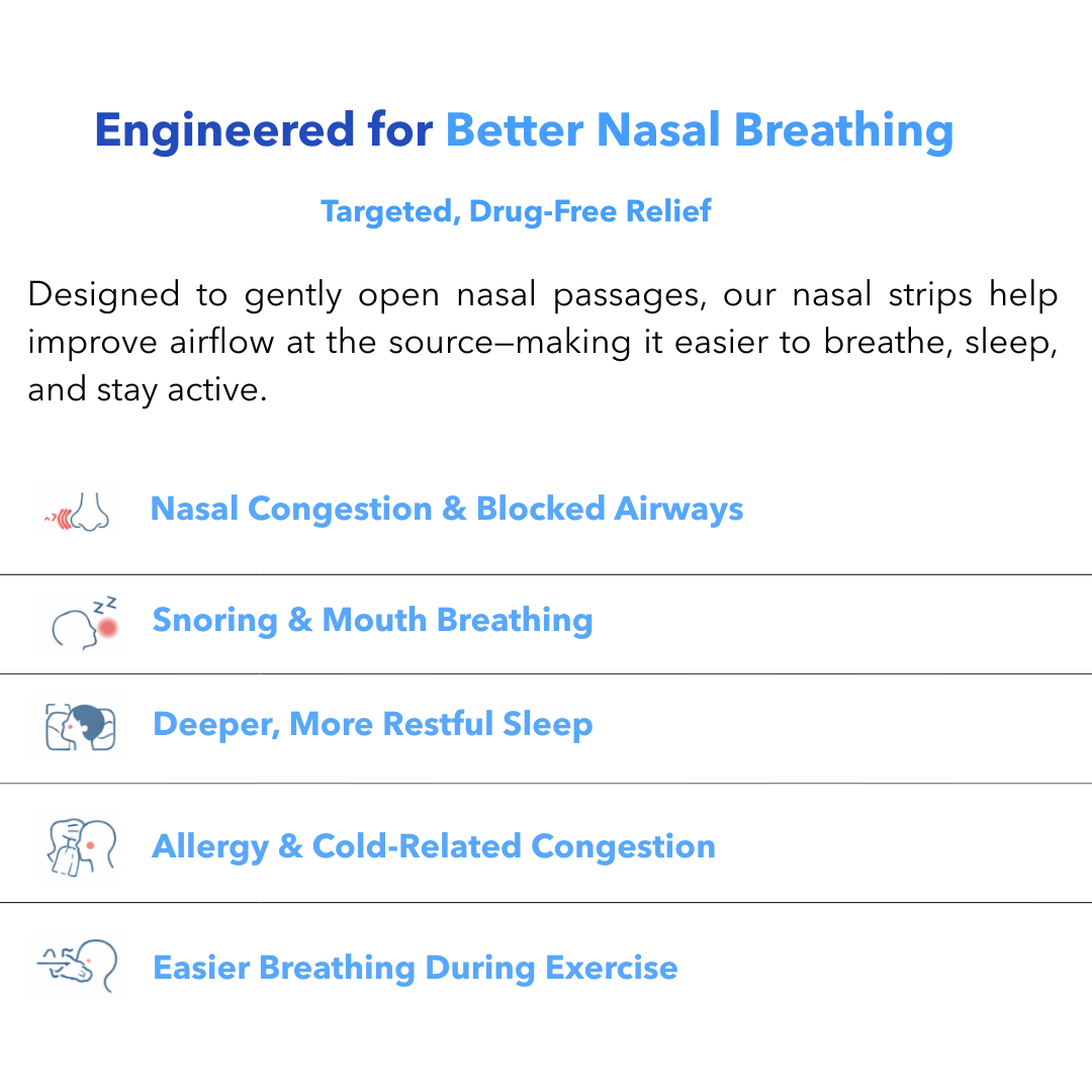 Gently lifts nasal passages to reduce congestion and enhance natural airflow. - Reduces Snoring & Mouth Breathing: